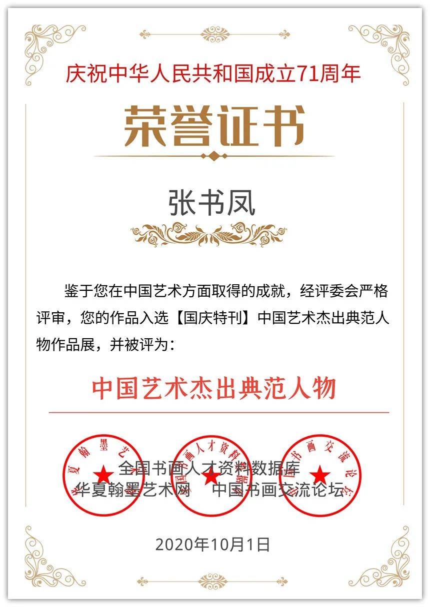 荣获为世界文化做有贡献的华人艺术家,世界杰出艺术家,中国新时代文艺传承人物,中国当代杰出爱国书法家、中国梦优秀艺术家、中国最美楷模人物、中国慈善大使、中华爱国艺术家 、中国当代红色爱国艺术家、中华爱国艺术家、中国当代军民鱼水情深艺术家、新时代经典艺术家,最具影响力品牌书法艺术人物,改革开放40周年先锋艺术家。作品入编国家级经典书籍文刊、荣获国家级各项奖项、作品被全国及世界各国机构及领导人收藏。作品被国家权威机构润格80000元/平方尺。百度搜寻“张书凤”