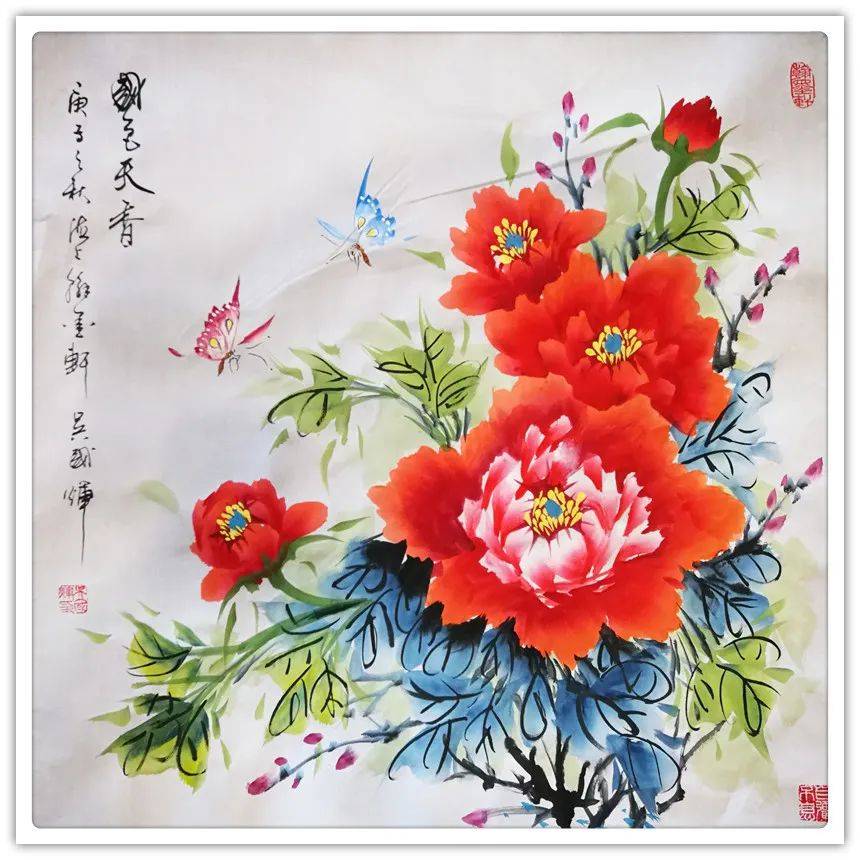 色彩在先生的作品中,亦是有着不可替代的位置。在用色上,先生创造艳丽形象的同时,还充分保持住了中国画的高雅格调,做到了色彩不因艳而显俗,他在北方画派偏用单纯色彩来补充墨色的特点上,加入了岭南派的艳丽色彩,两者进行了有机的结合,可以说是在用色上下足了功夫,在先生的色彩加持下,其花鸟焕然生新,前贤画花,总多以胭脂作花,花青为叶,色泽轻淡,以此显高雅之态,然先生却将其突破,在红中加白,尽显花朵亮丽夺目之势,叶子也掺以墨汁,如此既不失传统,又不失个人特质,从根本上讲,先生的色彩格调,是纯正的,更是独具匠心的。